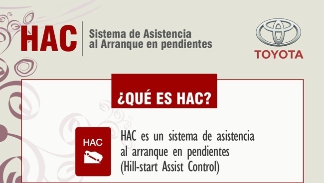 El sistema de asistencia en pendientes de Toyota, HAC, nos permite afrontar grandes desniveles ascendentes con la garantía de que no nos desplazaremos hacia atrás sin control al efectuar el juego de pedales: dejar el pedal de freno para acelerar en el proceso de arranque.