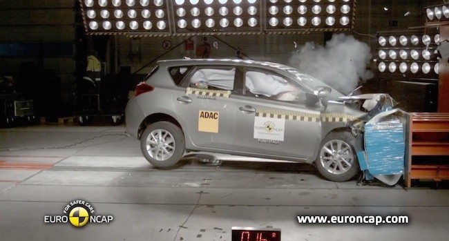 Impacto frontal, lateral del vehículo contra otro vehículo e impacto lateral de poste, protección de niños, protección de los peatones, latigazo cervical son algunos de los ensayos que se llevan a cabo en las instalaciones de cada marca y, más tarde, en las de la propia Euro NCAP. A continuación tenéis las imágenes de los ensayos del Toyota Auris (5 estrellas).