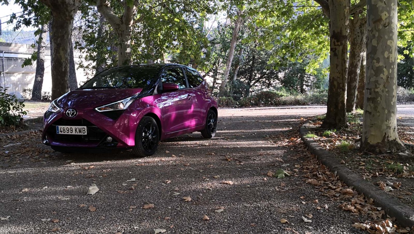 También esconde un punto macarra, con ese frontal a lo ‘Deadpool’ e incluso por el sonido del tres cilindros. Las firmas lumínicas de los faros delanteras y los pilotos es algo que nos han comentado por la calle y como situación más llamativa que nos hemos encontrado, es una ‘perturbadora’ obsesión por no dejarnos adelantar. Nos explicamos; por autopista, hemos visto como coches que circulaban a velocidad moderada o normal, aceleraban al ver como se acercaba un Toyota AYGO morado. Pero hablamos de una aceleración contundente, de sacar varios metros de diferencia y mantener esa posición alejada. En carreteras convencionales, el simple hecho de asomar el coche para ver si hay sitio para adelantar, resultaba en un aumento de velocidad del coche que teníamos delante. Es como si nadie quisiera ser adelantado por un coche pequeñito y morado. Todavía no conseguimos explicarnos el motivo de esta forma de actuar.