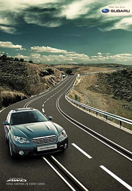 Pues este mensaje se amplia también para el Subaru Outback con este cartel, algo difícil de entender a primera vista, pero con una frase muy directa, control total en cada curva, igual que ocurre en los coches de slot (siempre que no te pases con el gatillo). Una curiosa forma de publicitar su sistema AWD.