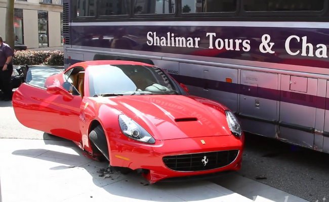 Sobre las causas del accidente no sabemos mucho. Tan sólo que el autobús golpeo al Ferrari California, que acabó golpeando el bordillo con una fuerza suficiente como para destrozar el eje delantero.