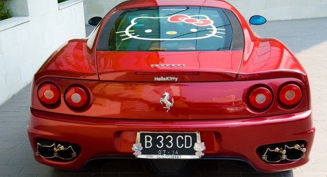 Se trata de un Ferrari 360 Módena con todo tipo de accesorios de Hello Kitty, la gatita que ya está presente hasta en las latas de aceite de los coches. El Ferrari 360 Módena, además de no ser del color “rojo Ferrari” que tan bien le sienta, ha sufrido la invasión de todo tipo de accesorios tanto en el interior como en el exterior.
