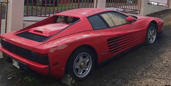 El Ferrari Testarossa objeto de todos los deseos y descaradamente abandonado es un modelo de 1987, con tuerca central en las llantas y dos retrovisores (aunque los coleccionistas suelen preferir la versión original monospecchio, con el retrovisor situada en media del pilar A).