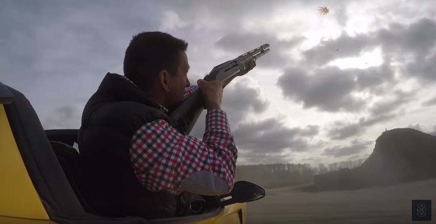 El hombre es capaz de demostrar su pericia disparando al plato desde el coche en movimiento, mientras este incluso hace unos divertidos donuts. No parece tener mala puntería, porque rompe varios platos mientras el motor V12 sube hasta el corte a 8.500 RPM.