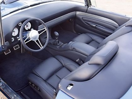 En el interior también se pueden ver grandes obras de ingeniería, como los asientos Porsche tapizados en cuero azul y calefactados por elementos de Saab con los reposacabezas eléctricos de BMW. El salpicadero también ha sido tapizado con cuero azul, e incluye los relojes del Dodge Viper.