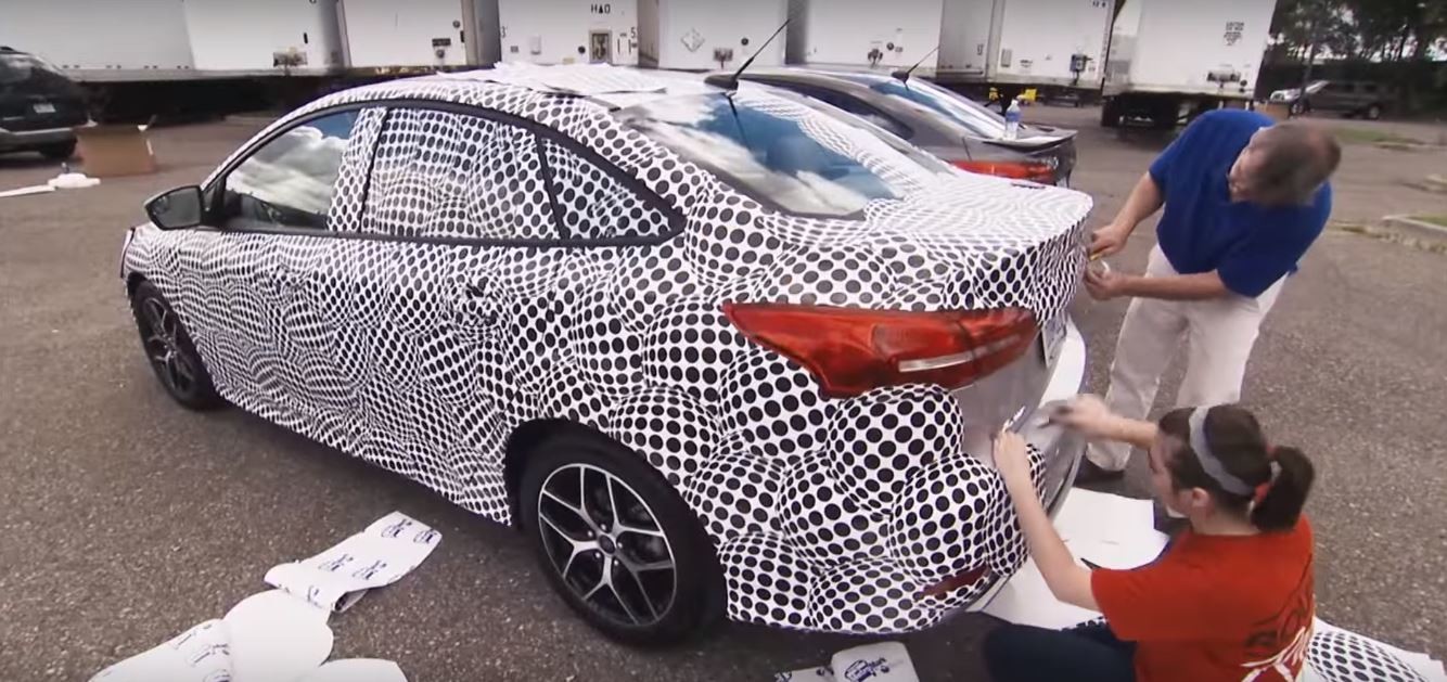 Vinilos con patrones dibujados que evitan que se distingan bien las formas. En este vídeo podemos ver el proceso de camuflaje de un Ford Mondeo Focus Sedán a base de este tipo de adhesivos. Tienen forma circular y un patrón de pequeños círculos negros sobre base blanca de diferentes tamaños que, al unir unos con otros y superponerlos generan un efecto óptico que disimula las formas.
