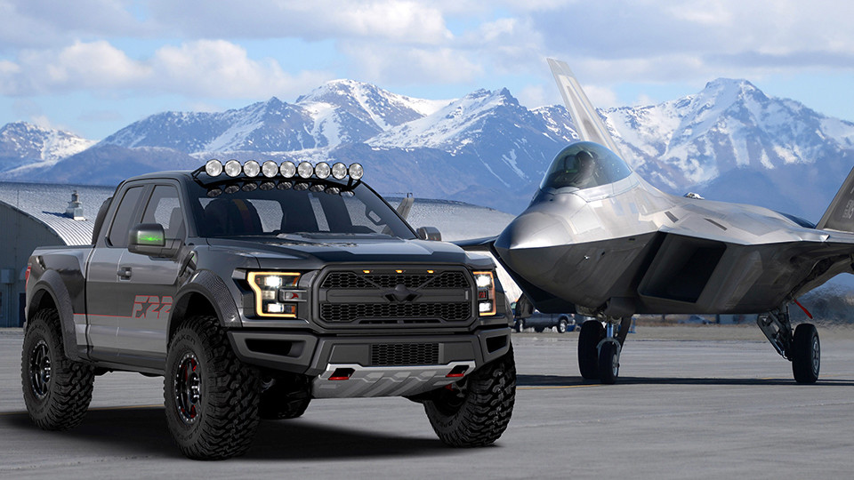 Con más de una década surcando los cielos, el F-22 Raptor influye en la Ford F-150 Raptor con una parrilla nueva con la vista frontal del avión (igual que los retrovisores), llantas de seis radios de nueva factura (con dos ruedas de repuesto en la caja, defensas, luces suplementarias y un trabajo de pintura stealth en gris y negro con detalles en rojo con el emblema F-22 repartido por su carrocería.