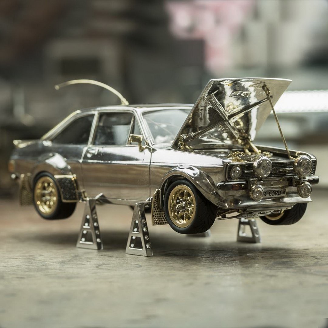 Es el caso del Ford Escort Mk2 de las imágenes, un modelo a escala 1:25 inspirado en el mítico coche de rallies que pilotó el famoso Ari Vatanen a finales de los años setenta, y que tiene muy poco de maqueta convencional. De hecho, está fabricado con oro, plata y piedras preciosas. Bien, ¿no?