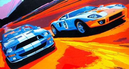 Dos mitos, el Ford Shelby GT500 2007 y el Ford GT 2006 pintados por Camilo Pardo, jefe de diseño del Ford GT y artista aficionado, para la portada del Winding Road magazine de septiembre.