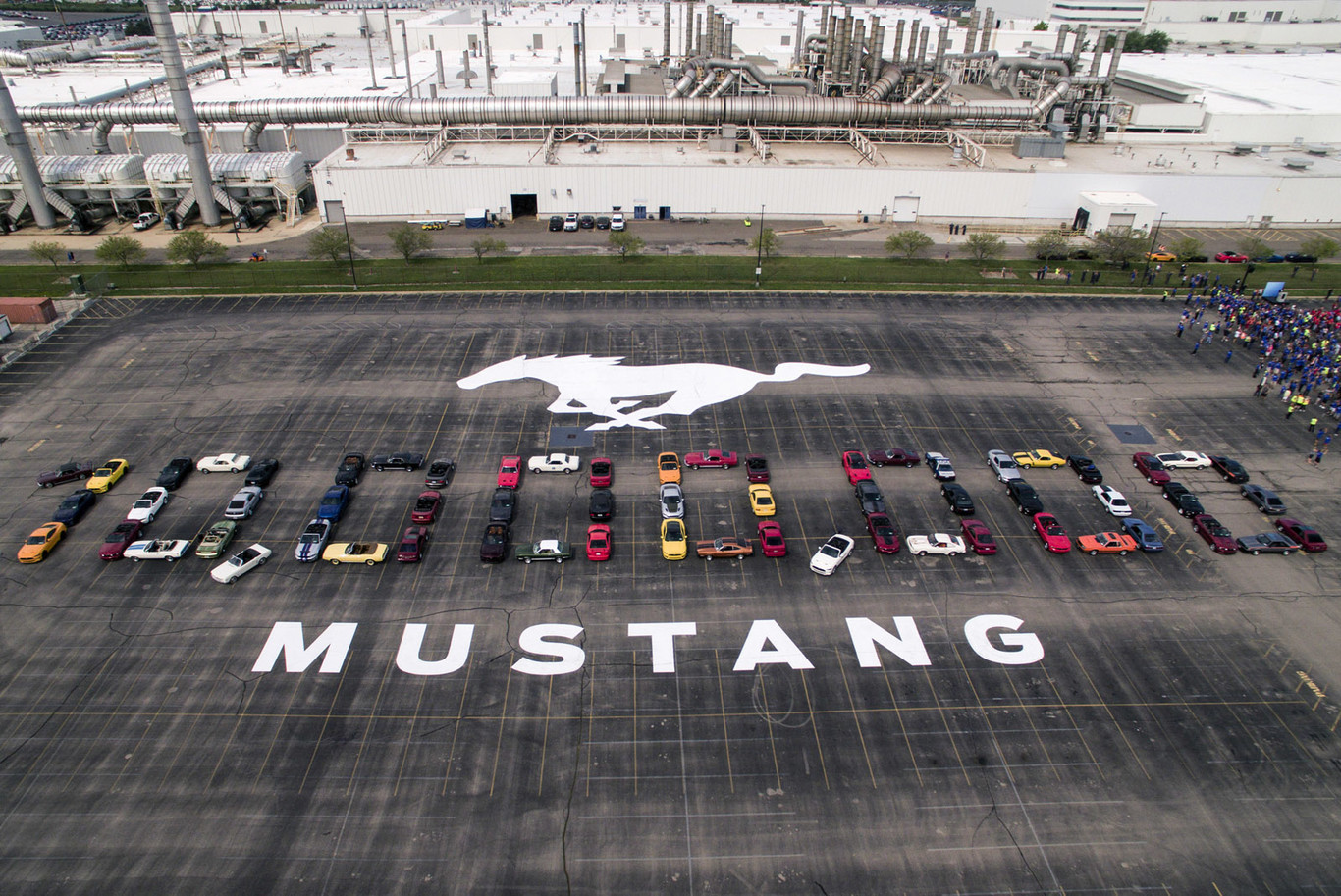 Con motivo de esta celebración, más de 60 propietarios de Ford Mustang han recorrido la distancia entre las plantas de Flat Rock (donde se produce el Mustang actualmente) y Dearborn (lugar donde también se fabricó en su día, al igual que en San José -California- y Metuchen -Nueva Jersey-) e incluso han dibujado la cifra de 10 millones con sus vehículos -en la foto de cabecera-.