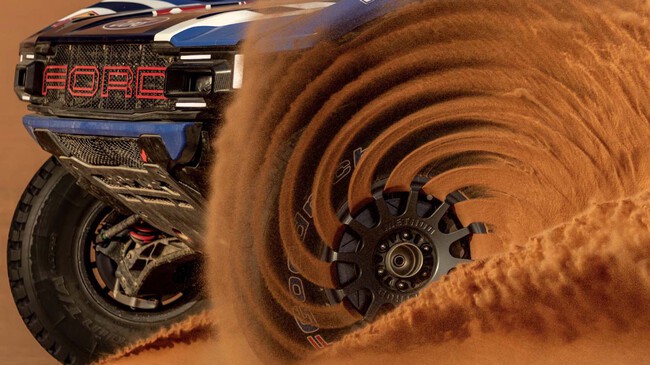 En la foto, la llanta de un Ford Raptor T1+ genera una espiral de arena mientras la rueda excava en la duna. El efecto de esa espiral es muy llamativo y Ford ha aprovechado la imagen para hablar del papel que tienen las llantas en un coche de competición como este y en un entorno tan complicado como el desierto. Se trata de unas llantas forjadas firmadas por Method Race Wheels y lo que dice Ford es que están diseñadas para ofrecer el equilibrio perfecto entre durabilidad y ligereza.