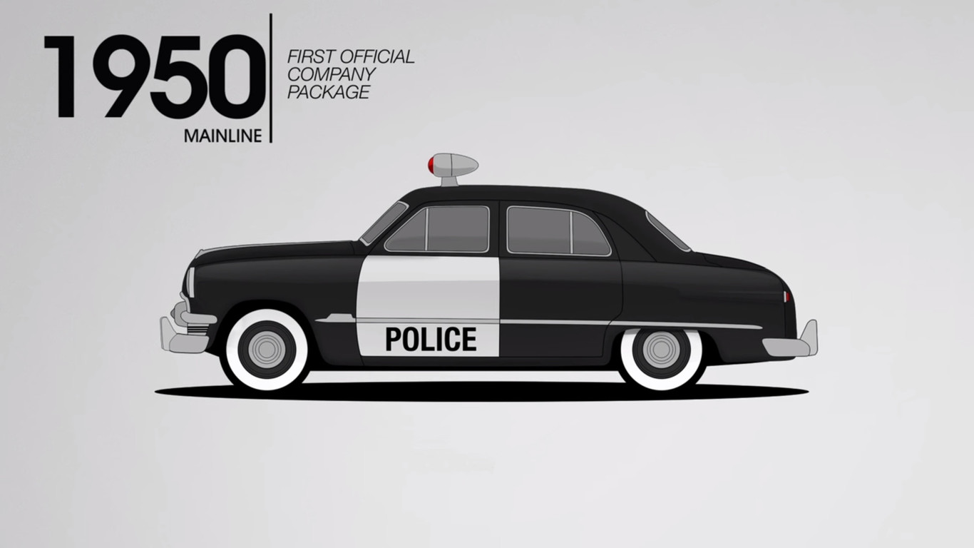 El vídeo arranca en el Ford Mainline de 1950, el primer modelo oficial de Ford creado expresamente para la policía, que tuvo su relevo en 1952, con el Ford Interceptor y sus asientos a prueba de jornadas maratonianas de trabajo.