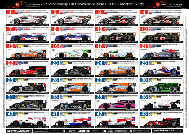 Como cada año, Andy Blackmore nos trae sus spotter guides de cara a las 24 horas de Le Mans. Uno de los dos elementos fundamentales si no quieres perderte nada de uno de los eventos más importantes de toda la temporada. Y es que con tanto Audi o tanto coche decorado con los colores de Lotus y Gulf, una guía visual con todos los participantes es algo obligatorio.
