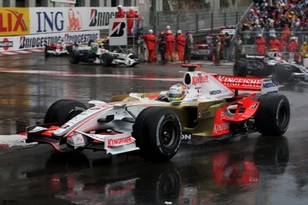 Y el alemán no sólo aguantó en mojado con sus intermedios, sino que con esas mismas gomas se permitió el lujo de marcar dos vueltas rápidas consecutivas cuando la pista empezaba a mejorar allá por la vuelta 36. En esos momentos tan delicados, eso es una demostración de muchas narices. Sutil paró en la vuelta 53 para cambiar a secos, ya que el carril en las calles de Mónaco era ya evidente, y con el paso de las vueltas seguía en esa 4ª plaza, rodando en todo momento como si llevara un coche puntero.