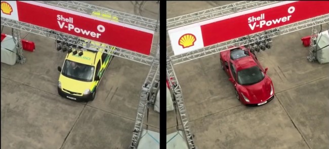 Ah, en ese caso la cosa podría cambiar. Sebastian Vettel cambió su Ferrari con Alex Knapton conductor de ambulancia de profesión y se dieron cita en un circuito. Rectas, curvas y hasta obstáculos para probar las virtudes tanto de los pilotos al volante como de sus bólidos.