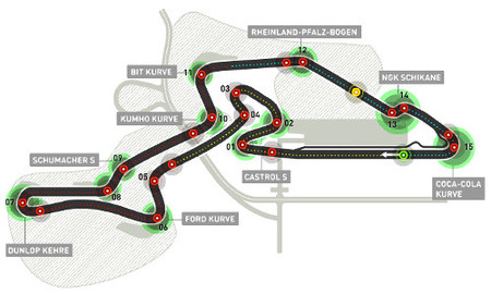 Los coches en Nürburgring suelen ir con bastante carga aerodinámica y cargar con un poco de más no penaliza en exceso siempre que el monoplaza ya de por sí responda bien en curvas. Es bastante peor cuando algún equipo con pocas salidas a un pobre rendimiento intenta enmendar descargando los alerones para ganar velocidad. Con lo que teniendo en cuenta los puntos de curvas enlazadas a ritmo alegre que tiene Nürburgring y la estabilidad que requiere a los monoplazas, no pinta un escenario muy favorable ni para McLaren Mercedes ni para Renault que están escasos de estos aspectos. Todo lo contrario que Red Bull, Brawn GP y Ferrari con sus últimas mejoras. Veremos qué tienen que tienen que decir sus pilotos.