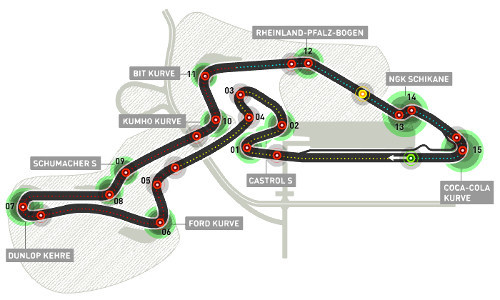 Está considerado como un circuito de baja-media velocidad. En Nürburgring los monoplazas no alcanzan velocidades que no alcancen en muchísimos circuitos del calendario. Otra cosa es que para ir lo rápido que se necesita en Nürburgring piloto y equipo se tienen que aplicar de lo lindo. Los abundantes desniveles, las primeras curvas cerradas y consecutivas, más de una curva crítica y ciega, y algún punto que otro que el asfalto acusa mucho los rizados que han ido dejando tras de sí el paso de diversas competiciones automovilísticas exigen trazar a conciencia siendo una pista en la que un error de puesta a punto, se paga muy caro.