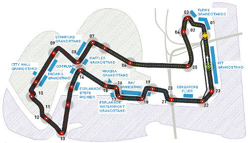 El urbano de Singapur es un circuito largo de 5.067 metros y 23 curvas. En sintonía con el Valencia Street Circuit, aunque gozando de menor anchura de pista y menor longitud. La gran mayoría de curvas rondan los 90 grados y se abordan en segunda o tercera velocidad. Dispone de varios tramos rápidos más allá de la recta principal en los que las velocidades punta rondarán los 300 km/h. El sentido de giro es contrario al de las agujas del reloj y se puede considerar como un circuito de media velocidad.