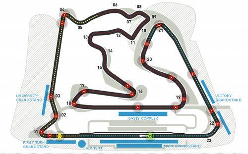 El largo, rapidísimo y polvoriento circuito estrena nuevo trazado para la Fórmula 1. Hasta hoy, los monoplazas de la máxima categoría empleaban la variante exterior del circuito de Bahréin. La más larga y también la más rápida. Pero este año tal como os informó GV27 cambian, y utilizarán una variante del circuito que suelen usar más que nada para las carreras de resistencia como las 24 Horas de Dubai. El segundo sector reduce un poco su velocidad media con ocho nuevas curvas de media velocidad que deberían ofrecer más posibilidades de adelantamientos a la par que aumenta la longitud del trazado a más de los seis kilómetros totales.