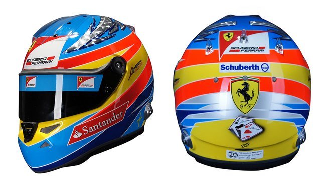Otro de los cambios más destacables son las flechas que coronan el casco, y que han estado presentes en todos los cascos de Fernando Alonso, cambian de forma y de color. Se vuelven más grandes y más relucientes. Como ya ocurriera el año pasado, ya que cuenta con contrato con Ferrari, el casco es de la marca Schuberth. Realizado a medida en fibra de carbono, hasta 16 capas, el casco pesa tan sólo 1.3 kilos.