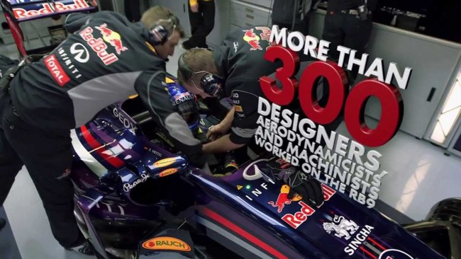 Como siempre, las cifras son mareantes. Cada Red Bull RB9 cuenta con 6.500 piezas que a su vez podrían desglosarse en 100.000 componentes aunque quizás lo más sorprendente es que la propia escudería sea la encargada de fabricar un 70% de las mismas. Para ello, en la sede de la escudería en Milton Keynes trabajan con más de sesenta tipos de metales distintos. Y como no todo van a ser alabanzas. En este vídeo mucho bla bla bla de Christian Horner y los suyos y muchas imágenes repetidas...