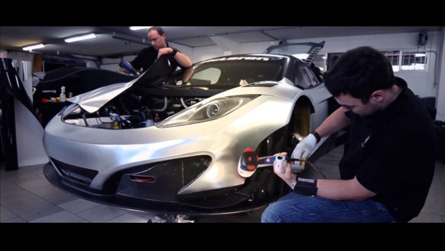 Por ello, nada mejor que ellos para enseñarnos como se decora una de sus McLaren de competición de arriba a abajo. La fibra de carbono deja paso al vinilo y gracias a las manos de los especialistas (desde aquí un saludo a todos aquellos que se dedican a ello), con algo de ayuda de la pistola de calor para dar forma en las curvas, el McLaren MP4-12c GT3 cobra vida. El próximo 8 de abril, el circuito francés de Nogaro subirá el telón de la temporada 2012 del FIA GT1.