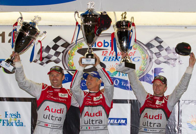 Y así fue. Los Audi marcaron los mejores tiempos en la clasificación y salieron a la pista con el objetivo de dilucidar cual de las tres formaciones se hacía con el triunfo final. No tardaron en llegar los primeros problemas ya que la primera unidad, la de Fassler-Lotterer-Treluyer, tenía que entrar en boxes con una avería eléctrica. A partir de ahí, la lucha entre las otras dos unidades no cejó hasta que a falta de dos horas de carrera, el Audi R18 TDI de Loïc Duval, Timo Bernhard y Romain Dumas sufría un pequeño accidente en carrera que lo retrasaba. La tripleta más veterana y laureada de Audi, formada por Allan McNish, Dindo Capello y Tom Kristensen lograba la victoria en las 12 horas de Sebring.