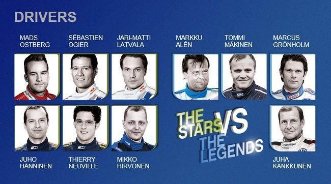 Frente a ellos, seis pilotos del actual WRC, entre los que se encontrarán los pilotos de Volkswagen Jari-Matti Latvala y Sébastien Ogier, los de Hyundai Juho Hänninen y Thierry Neuville, Mads Ostberg y Mikko Hirvonen. Obviamente, este grupo de pilotos llevará su habitual montura, mientras que entre las leyendas del pasado se ha realizado un sorteo por el cual Mäkinen compartirá el Ford Fiesta RS WRC con su compatriota Hirvonen, Mäkinen el DS3 con Ostberg, Alen el Polo R WRC y Grönholm el i20.
