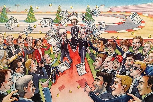 En la postal que os mostramos sobre este texto Bernie contrae matrimonio con Jean Todt, Presidente de la FIA, emulando el Pacto de la Concordia que han firmado este año. Oficiando este enlace está Luca Cordero di Montezemolo, que en estos temas políticos no podía faltar. A ambos lados de la pasarela, sobre la que caen páginas del importante Pacto, se encuentran los invitados. Por una parte, los jefes de equipo y por otra, los pilotos, entre los que destacan Sebastian Vettel con su dedo índice al alza y Felipe Massa echando unas lagrimitas con la gorra de Ferrari.