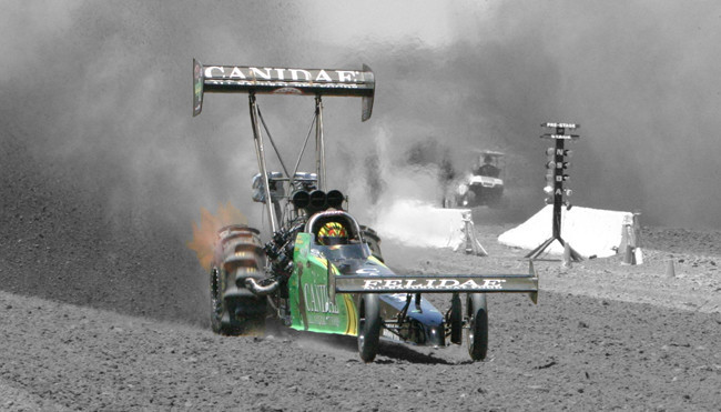 Para comenzar la sección he decidido recurrir a una competición que descubrí recientemente: las carreras de dragster en la arena. No se trata más que llevar los famosos dragster del cuarto de milla a un terreno menos uniforme como lo es la arena. Como no podría ser de otra manera, esta competición tiene su lugar de origen en los Estados Unidos. A los dragster de asfalto les colocan ruedas para "volar" sobre la arena. Como no podría ser de otra manera, esta competición está regulada y tiene su propia federación, la National Sand Racing Asocciation.