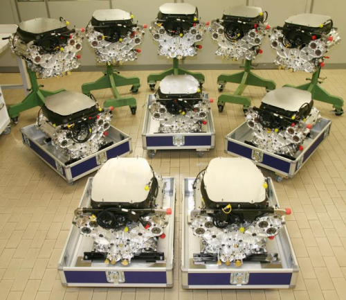En la foto, las diez primeras unidades del nuevo V8 de Cosworth, el CS2010. Tras mucho trabajo, la empresa británica ya tiene preparadas las primeras unidades que tendrán que salir cuanto antes de su sede de Northhampton y poner destino a sus nuevos propietarios: Williams, Campos Meta, Lotus F1 Racing, US F1 y Virgin Racing.
