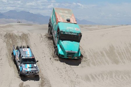 En la categoría de camiones, la batalla esperada entre los Kamaz y IVECO no fue tal. Desde el primer momento, el IVECO de Jan de Rooy tomó el mando y ya no lo dejó hasta Lima. El holandés además ha contado con un fantástico Pep Vila como mochilero, aguatero en sudamérica. Lástima de los problemas técnicos sufridos que lo retrasaron y le impidieron lograr la que hubiera sido la mejor clasificación de un español hasta la fecha.