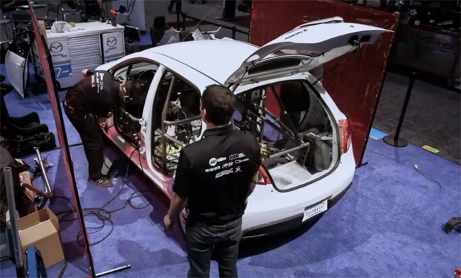 Durante el pasado mes de diciembre se celebró el Performance Racing Industry, una feria destinada a todo aquello relacionado con el mundo de la competición. Una especie de Autosport International (que se celebrará entre el 10 y el 13 de enero próximos) celebrado al otro lado del charco. El evento fue escogido por Mazda Motorsports para mostrarnos como su departamento encargado de la fabricación de un vehículo de competición, Mazdaspeed Motorsports Development, era capaz de convertir en tan sólo 25 horas un Mazda 2 en un vehículo de competición.