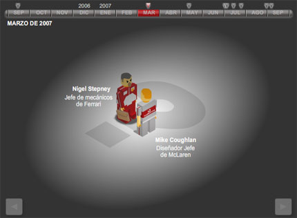 A través de GTalk, delarosa me avisa de esta genial cronología de todo lo que ha sucedido alrededor del caso de espionaje entre McLaren y Ferrari.