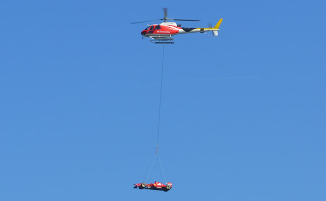 Ver a un Ferrari sobrevolar Barcelona es uno de esos acontecimientos que se pueden contemplar... ¿nunca? Bueno, sí, hoy se ha podido ver con motivo del Gran Premio de España de F1 que se celebra este fin de semana en el Circuit de Catalunya. A los del Banco Santander les ha dado por liarla y han pillado un helicóptero, le han colgado el monoplaza y han celebrado la llegada de la Fórmula 1 a Europa después de cuatro carreras compitiendo en Oceanía y Asia.