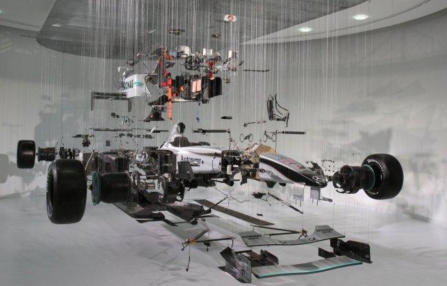 La impresión que quieren dar mostrando el Mercedes GP de esa forma es que parezca que está congelado en el tiempo una fracción de segundo después de haber explotado. Así las personas que visiten la exposición podrán hacerse una idea de todos los componentes que forman un monoplaza en la actualidad.