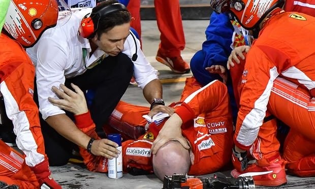 El Gran Premio de Baréin de Fórmula 1 que ganó Sebastian Vettel ayer fue más complicado de la cuenta para algunos, y esta vez no hablamos de Fernando Alonso. Kimmi Raikkonen no pudo acabar la prueba debido al incidente que sufrió en la segunda parada de boxes, una parada en la que el de Ferrari se llevó por delante la pierna de uno de sus mecánicos.