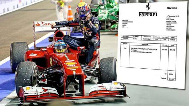 Ferrari ha mostrado una factura, supuestamente envíada en tono de broma a Webber, por los servicios prestados por Alonso. Y ya podemos decir que subirse a un Ferrari no es barato. La factura asciende a 27.500 dólares con una sustanciosa propina de 2.500 dólares. Y eso que la carrera no fue demasiado larga...¿Estarán buscando ingresos exta para el desarrollo del monoplaza de 2014?