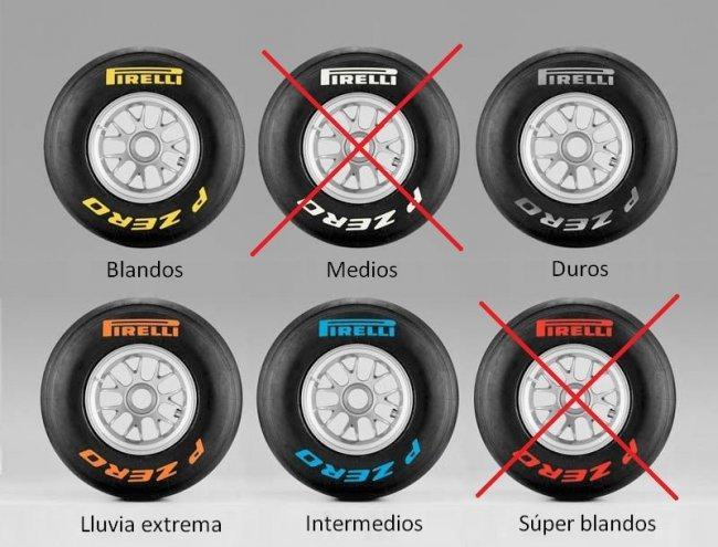 Este fin de semana los equipos dispondrán de un juego extra de duros para ser usados en la jornada de entrenamientos libres del viernes. Esto hará que puedan emplear un total de doce juegos entre el viernes, el sábado y el domingo, cuando lo normal será que tengan once juegos.