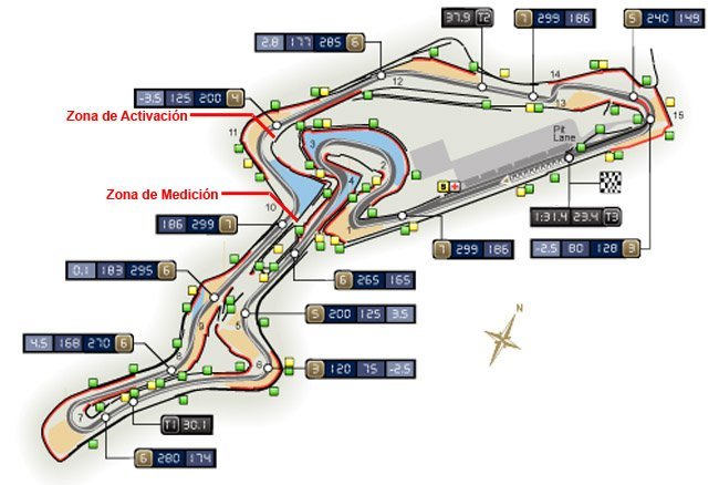La zona escogida comprende desde la salida de la curva 11, curva Warsteiner, (falta por conocer el punto exacto) hasta la chicane NGK, e incluye la curva 12 (curva Advan). La zona de medición estará tan sólo una curva antes, en la frenada de la curva 10 (ahora mismo sin un patrocinador que le de nombre). Por cierto, un detalle. Los nombres están sacados de la propia página del circuito ya que estos varían bastante en función de dónde busques la información.
