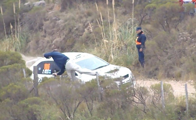 Obviamente, esto tienes sus riesgos, y si en otras ocasiones han sido los aficionados los que se encontraban mal colocados (dando lugar a múltiples situaciones de peligro), esta vez le ha tocado pasar miedo a un periodista de una de las cadenas de radio más populares de “la Argentina". Cristian Moreschi, que se encontraba cubriendo el tramo Ascochinga - La Cumbre estaba acudiendo a enterarse de la última información del coche volcado de Luciano Petro y cuando regresaba de hacerlo coincidió con el momento en el que llegaba otro participante.