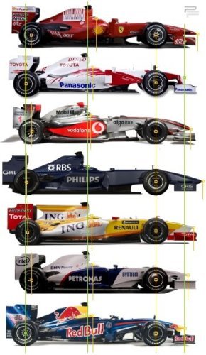 De entrada, y viendo que los monoplazas están alineados haciendo coincidir el eje de la rueda delantera, se puede echar un vistazo rápido a las batallas de los diversos coches (distancia entre ejes delantero y trasero), que van desde la opción tirando a larga del Red Bull, el Toyota, el Williams y el Renault, a la más corta de los tres considerados más potentes, Ferrari, McLaren y BMW.