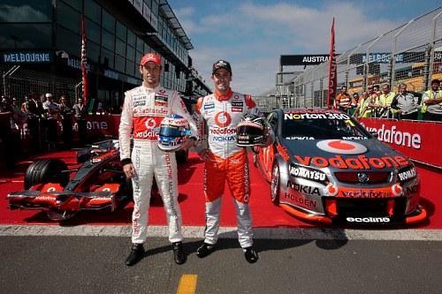 Tal como lo oís. El vigente Campeón del Mundo de Fórmula 1 Jenson Button y el vigente Campeón Nacional de la V8 Supercars (y actual líder en la clasificación) Jamie Whincup intercambiaron durante unos momentos sus herramientas de trabajo*. Dos máquinas tan parecidas como un huevo y una castaña: Whincup se subió al McLaren Mercedes MP4-23, y Button le tomó prestado a Jamie su flamante Holden Commodore VE. El único punto en común, que ambos tienen cuatro ruedas, y que rinden potencias superiores a los 600 CV. Pero las sensaciones de ambos resultaron ser bastante parecidas.