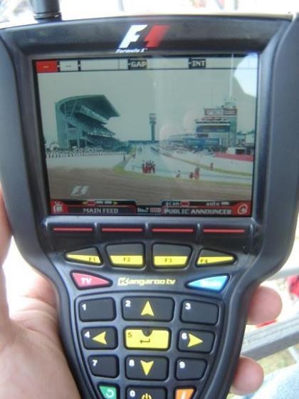 De esta forma, me planté con mi Kangaroo TV colgado del cuello dispuesto a comprobar si realmente había invertido bien o no esos 50 preciosos euros. De entrada, comentaros que el manejo de esta mini-televisión con mando a distancia incorporado es extremadamente sencillo. Con sólo 3 botones (menú, TV y estadísticas) y las flechas puedes llegar a cualquiera de las funciones que están a tu alcance. Las principales dudas que me abordaban eran: 1) ¿Se verá bien la imagen dándole el sol de lleno a la pantalla? y 2)¿Se oirá bien el audio teniendo en cuenta el sonido en directo de los monoplazas? Y las dos respuestas fueron satisfactorias: se ve estupendamente y tiene un rango de volumen ajustable que, puesto al máximo, te puede dejar sordo.