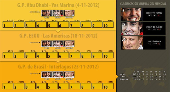 Como ya ocurriera en temporadas anteriores, con el final del campeonato es hora de hacer cuentas y nada mejor para ello que la calculadora del Mundial de Fórmula 1 cortesía de Marca.com. De una forma sencilla podemos hacer nuestras predicciones para los tres últimos grandes premios de la temporada y así ver quien se haría con el título.
