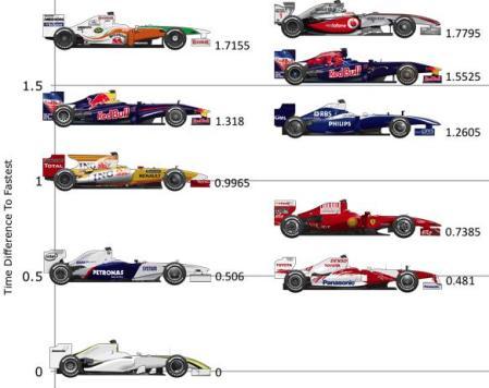El resumen es claro: todos los monoplazas están en un margen de 1,8 segundos, siendo el BGP 001 de Brawn GP el más rápido, y el MP4-24 de McLaren el más lento, por detrás incluso del Force India. El más inmediato perseguidor del Brawn Gp, aunque ya a casi medio segundo, es el Toyota, seguido muy de cerca por el BMW. Ferrari parece un pelín descolgada de estas dos, con Renault ya por detrás y a 1 segundo del BGP 001.