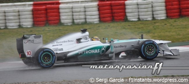 Mañana complicada, la vivida en el Circuit de Catalunya, con la lluvia como gran protagonista y Lewis Hamilton marcando el mejor tiempo. El piloto británico ha sido el más rápido durante una tanda relativamente larga. Mercedes necesita seguir rodando, aunque sea bajo la lluvia, para seguir compensando la falta de rodaje de los primeros días en Jerez.
