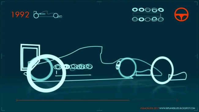 A veces no hace falta ser muy rebuscado para explicar las cosas. Este vídeo es el mejor ejemplo de ello. Simple pero efectivo. En tan solo un minuto de animación nos muestran como ha evolucionado la Fórmula 1 en sus 62 años de historia. Utilizando tres parámetros: la forma de los monoplazas, la morfología de los volantes y el tamaño de los propulsores podemos ver como ha cambiado la máxima categoría.