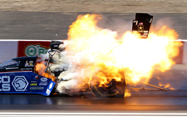 Durante la disputa de la primera prueba de la temporada, la O’Reilly Auto Parts NHRA Winternationals disputada en el circuito de Pomona en California, Antron Brown vio como su Top Fuel se desintegraba en plena carrera. Tras la explosión, el vehículo perdía el control por completo (las ruedas traseras habían desaparecido tras la explosión) impactando varias veces contra los muros. Por suerte, la cúpula hizo su trabajo y el aturdido piloto pudo salir por su propio pie. Eso sí, a pesar de la victoria no pudo seguir luchando por la victoria en las semifinales de la cita.