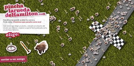 Mañana por la tarde conoceremos el esperado desenlace de la temporada de Fórmula 1, las cosas no parecen pintar bien para Alonso pero la esperanza sigue ahí. Para descargar la tensión, podemos pasarnos por la página pinchalaruedadehamilton.com, que como su nombre indica, nos permite dejarle un pequeño regalito en el circuito de Interlagos en forma de clavo, chincheta o erizo.
